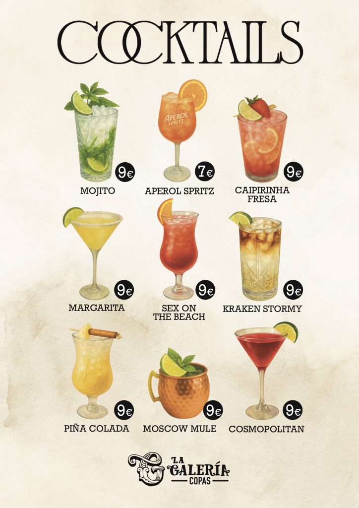 En La Galería Copas podrás disfrutar cócteles  y las mejores bebidas nacionales e internacionales, servidas por nuestro especializado personal. Aquí encontrarás el mejor ambiente de Fuengirola ya sea de día o de noche, un lugar pensado para el esparcimiento y la relajación en el que te sentirás como en casa.