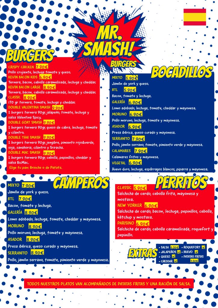 En Mr. SMASH servimos genuinas burguers Smash: carne jugosa y crujiente, ingredientes frescos y sabor auténtico. Además, ofrecemos bocadillos, camperos y perritos calientes, todo preparado con nuestro toque especial. Calidad, rapidez y un sabor inconfundible que te hará repetir.
