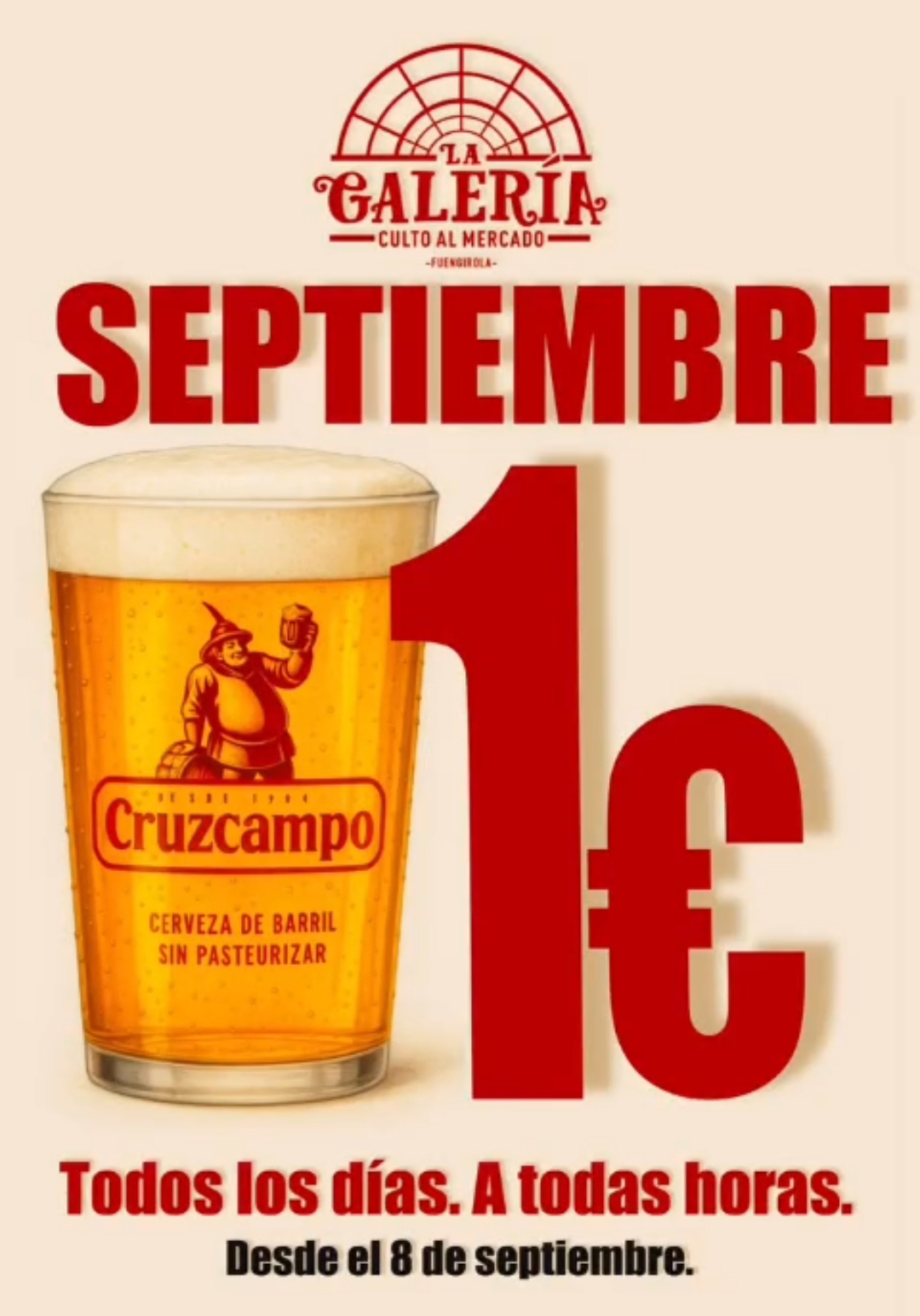 Así que ya lo sabes: pásate por La Galería, pide tu Cruzcampo y brinda por lo que realmente cuenta. Porque ahora, tu caña está a solo 1€.